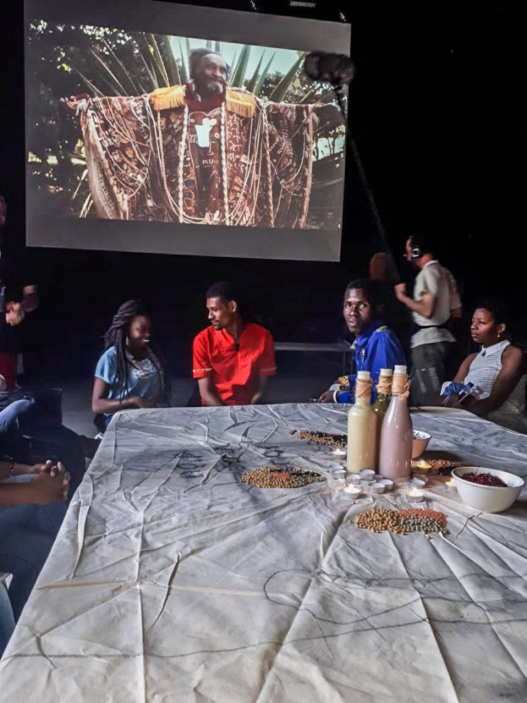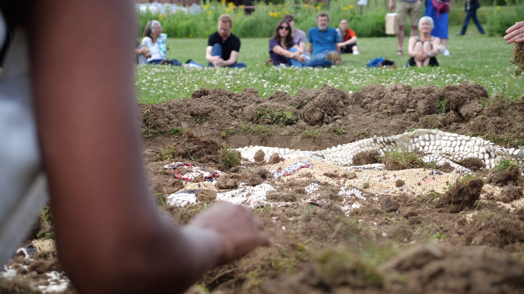 - Veillée collective du manteau : le manteau est encore colère. Les participants sont conviés à un processus intime de connexion avec le manteau. Des boissons préparées avec des semences rituelles sont distribuées. Ceux qui se sentent en connexion avec ce processus sont invités à broder les premières graines et à noter leur nom à l’intérieur du manteau. On démarre l’inventaire du monde.