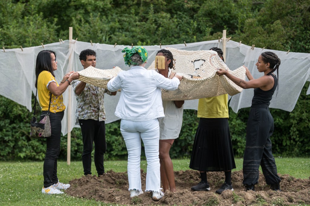 - Cérémonie d’enterrement du manteau : les participants seront ensuite invités à participer à la cérémonie d’enterrement du manteau, que, brodé avec des semences vivantes qui germent, renaîtra en forme de jardin. Ce manteau-jardin s’instaure ainsi comme un dialogue par la transmutation avec Bispo do Rosario et, par conséquent, avec tout ce qui n’a pas encore été à nouveau remis en mouvement ou restitué.